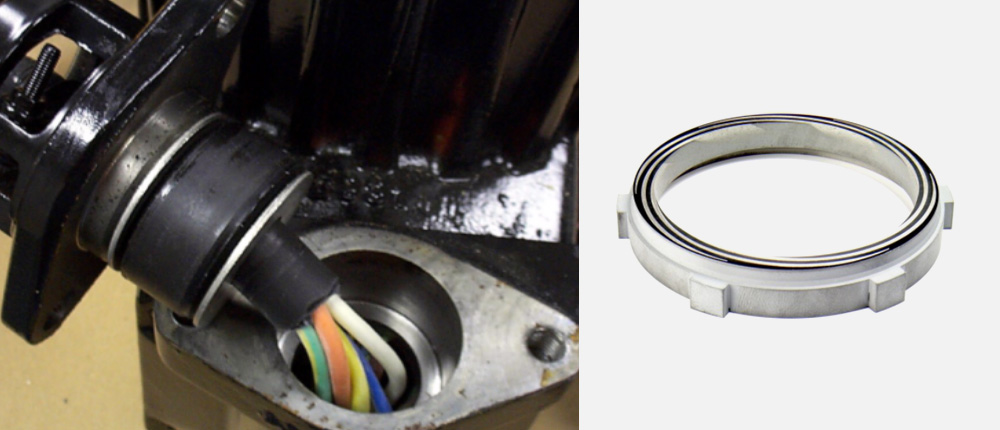 為了防止由于電纜的密封失效而使介質(zhì)進入電機的隱患,飛力水泵的電纜進線密封設(shè)計能消除一定的扭矩以形成一個防水的潛水密封。電纜進線包括一個柱形高彈性襯套,兩邊有墊圈,都與電纜和電纜進線緊密結(jié)合,電纜進線擠壓襯套以達到一個出口冒氣功能,該密封保證電纜更換方便。