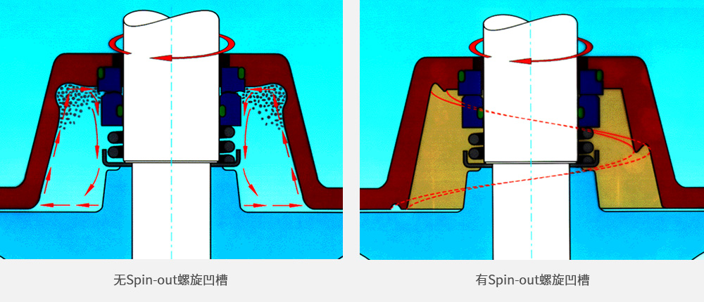 飛力水泵的外密封腔內(nèi)有一個獨特設(shè)計的Spin-out螺旋凹槽,這項技術(shù)是飛力發(fā)明的專利技術(shù)。通過在外密封腔設(shè)計一個螺旋凹槽,離心力會把固體顆粒沿著螺旋槽方向送出密封腔,防止磨損性固體顆粒沉積在密封槽溝內(nèi)側(cè)部分,從而達到去除雜質(zhì)顆粒、減少磨損的目的。這樣的設(shè)計在一定程度上也延長了水泵的壽命,確保水泵的安全穩(wěn)定運行。