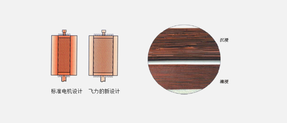 而飛力采用一種TRICKLE(滴浸)的工藝進行浸漬絕緣處理,使絕緣樹脂流進繞組內(nèi),而毛細作用產(chǎn)生的吸力會將絕緣樹脂沿著每股導(dǎo)線吸入并填滿間隙而消除氣孔。從而使電機熱量得到更好的傳導(dǎo)。